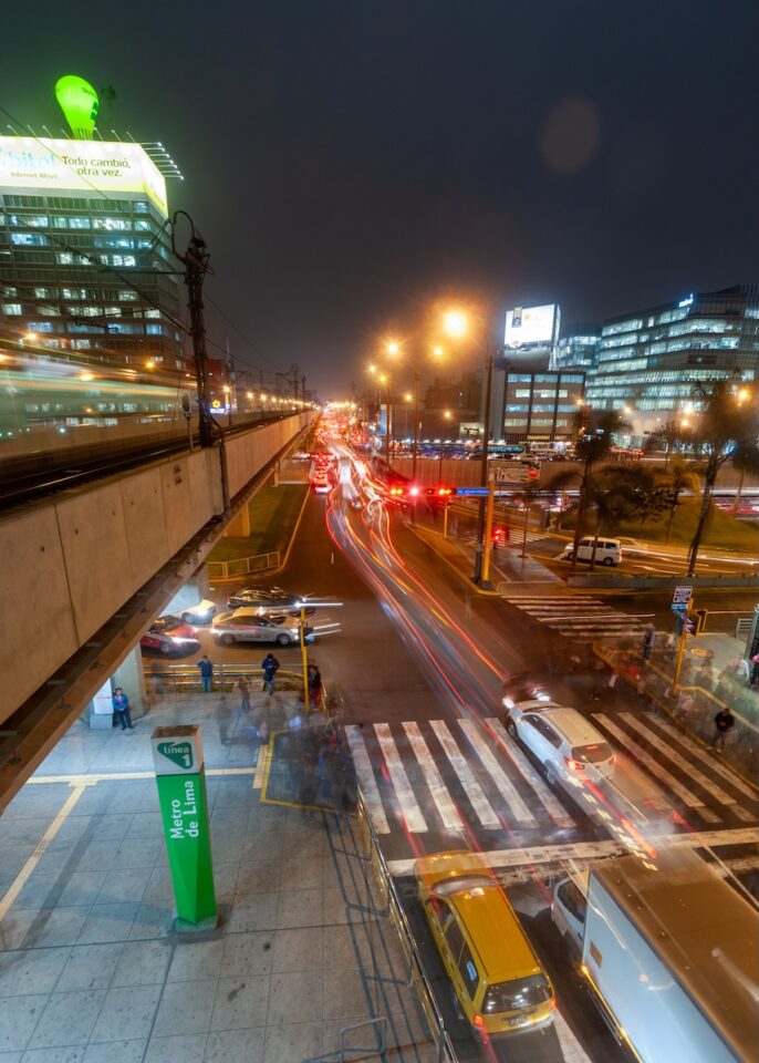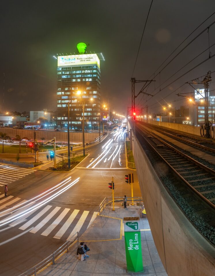Desde la estación se puede observar cómo Javier Prado se extiende como un eje luminoso, mientras Aviación conecta distintos flujos de tránsito que llegan desde varios distritos. Los semáforos regulan el ritmo, los buses se detienen brevemente en los paraderos y el tren aparece de vez en cuando sobre el viaducto, cruzando la escena con una presencia casi silenciosa.