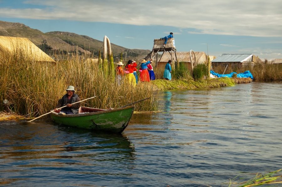 En el fondo de muchas de las imágenes se distinguen viviendas, torres y muelles, todos hechos del mismo material. Aquí, la totora no es solo transporte: es hogar, alimento, herramienta y memoria.